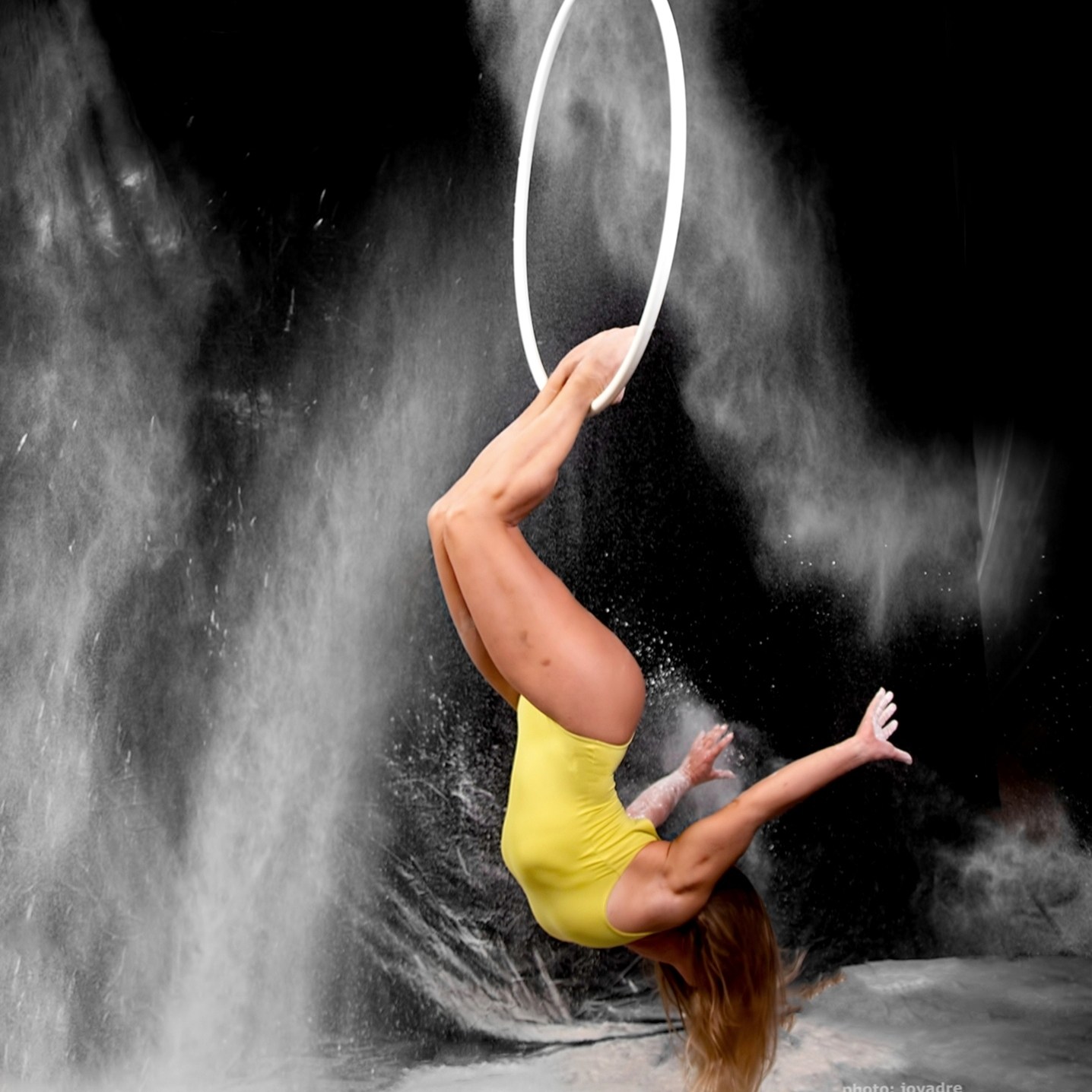 My specialization is aerial hoop (also called lyra or aerial ring). The aerial hoop is a circus discipline with a hanging, circular steel apparatus, able to spin or swing.